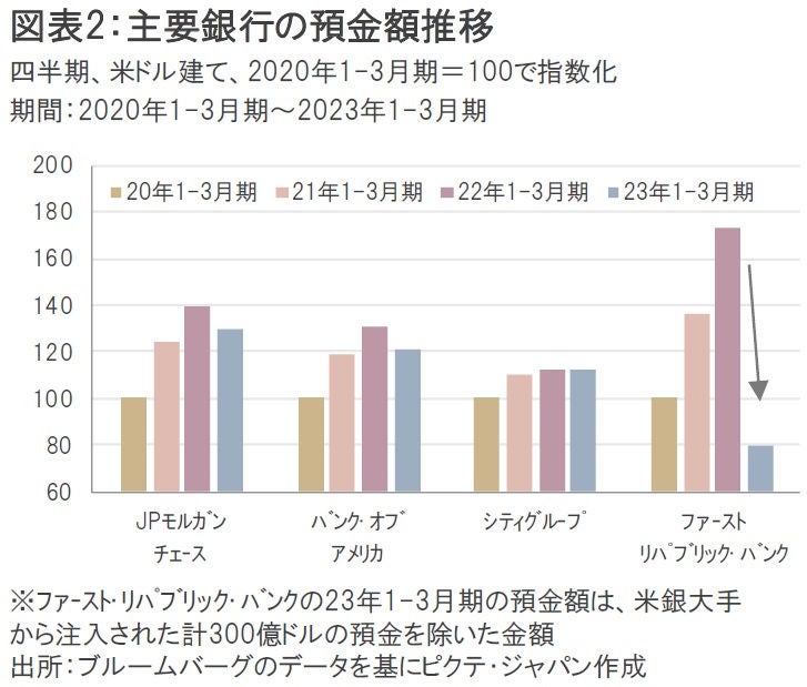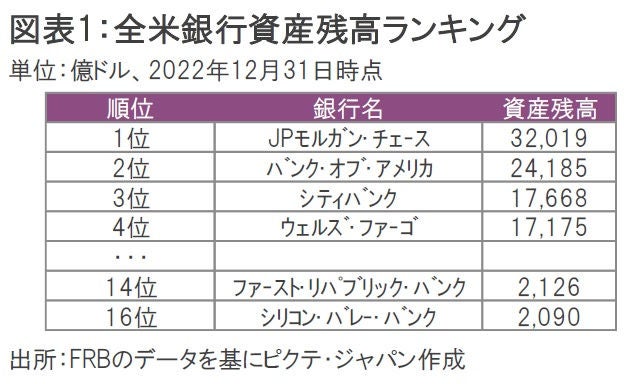 2022年12月末時点の資産規模で全米14位の地銀だったファースト・リパブリック・バンク(FRC)が5月1日付で経営破綻となり、米連邦預金保険公社(FDIC)の公的管理下に置かれた(図表1)。米銀の破綻としては、2008年に経営破綻した米貯蓄金融機関ワシントン・ミューチュアルに次ぐ史上2番目の規模となる。