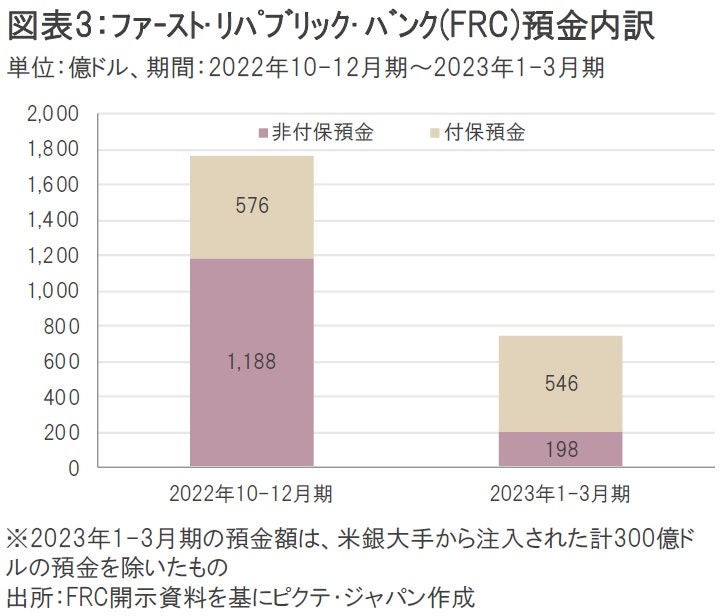 なぜFRCは破綻してしまったのか?事の発端は3月のシリコン・バレー・バンク(SVB)破綻だ。経営不安が広がったSVBでは預金保護の対象とならない非付保預金が大量に流出し、経営破綻に追い込まれた。FRCはSVBと同様、非付保預金が全体に占める割合が高かったことから、米銀大手11行による救済措置でFRCに対して計300億ドルの預金を注入したにもかかわらず、預金流出を食い止めることはできなかった(図表2、3)。