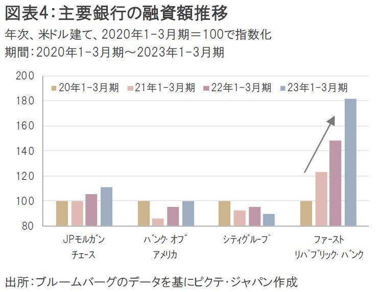 問題は資産サイドにもある。FRCはここ数年で急激に融資を伸ばすアグレッシブな経営を行ってきた。主要銀行と比較しても、そのペースが突出していたことが分かる(図表4)。