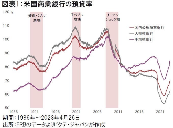 ITバブル崩壊、そしてリーマンショック・・・この2つの歴史的な金融危機直前、米国の商業銀行の預貸率は100%を超えていた(図表1)。従って、信用不安が広がり預金の引き出しが起こると、銀行は融資の回収、資産の売却による現金の確保を迫られ、経済が一気に失速したのだ。