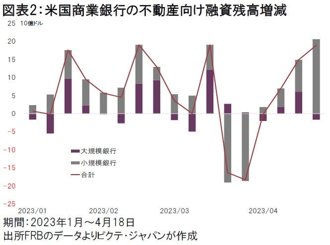 ちなみに、もっとも懸念されている不動産関連の融資は、3月後半に347億ドル減少した(図表2)。もっとも、4月は第4週までに406億ドル増加している。つまり、SVBの破綻を受け一時的に与信の縮小はあったが、米国の商業銀行も融資先の開拓に苦労しているため、今のところそれは一過性の動きに止まっている模様だ。
