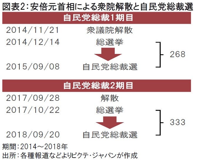安倍晋三元首相は、2015年9月、2018年9月、現職として2回の自民党総裁選で再選された。その約1年前となる2014年11月21日、2017年9月28日、衆議院を解散、総選挙で勝利したことにより自民党内での指導力を強化したのである(図表2)。岸田首相が来年9月の自民党総裁選に勝つためには、今年末までに国民に信を問うことが必須だろう。