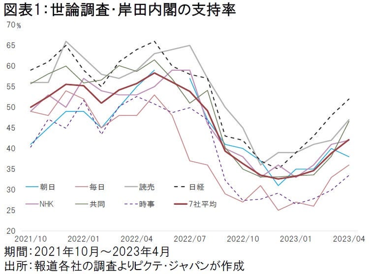 主要報道7社の世論調査を見ると、岸田内閣の支持率が昨年12月を底に上昇へ転じている(図表1)。3月16、17日の尹錫悦大統領の訪日、同21、22日の岸田首相によるウクライナへの電撃訪問は、有権者の政権に対する評価を押し上げる上で大きく貢献したようだ。また、内政面において、新型コロナの水際対策撤廃による訪日外客の増加、2月検針分からの電力・ガス料金への補助金給付なども、取り敢えずは好意的に受け止められているのだろう。