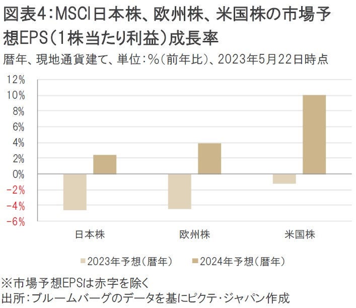 ここで重要な点は、日本株の企業業績見通し(ファンダメンタルズ)が現時点で必ずしも好調とは言えないことだ。日本株の市場予想EPS(1株当たり利益)成長率は、米国株や欧州株と比較して劣後しており(図表4)、EPSリビジョン(市場予想EPSが上方修正された銘柄の割合)も決して上向いているわけではない。