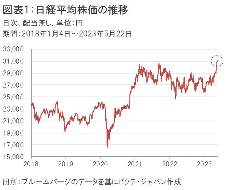 5月22日(月)の日経平均株価(終値)は、前日比0.90%高の3万1086円82銭となった。3万1000円の節目を超えたのは1990年7月31日以来、約33年ぶりの出来事になる(図表1)。
