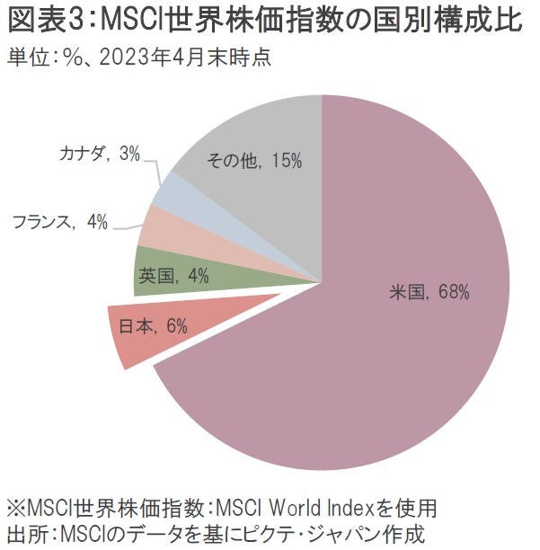買いポジションのみでアクティブ運用する「ロングオンリー(Long-only)戦略」の機関投資家は、MSCI世界株価指数(MSCI World Index)をベンチマークとするケースが多い。MSCI世界株価指数は、先進国株式市場で取引可能な銘柄群を浮動株調整後の時価総額加重平均で組み入れたものだ。この株価指数における国別構成比率を見ると、日本株は米国株に次いで2番目に大きい市場となっているが、米国株との規模の差は圧倒的だ(図表3)。