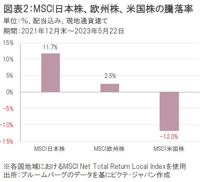 主要な先進国株式市場の中でも、日本株の相対パフォーマンスは際立っている。2021年12月末から直近5月22日までの株価騰落率を見ると、MSCI日本株指数は11.7%高であるのに対し、MSCI欧州株指数は同2.5%高、MSCI米国株は同12.0%安となっている(図表2)。ここまでパフォーマンス格差がつけば、機関投資家も日本株の「持たざるリスク」を意識せざるを得ない状況だろう。