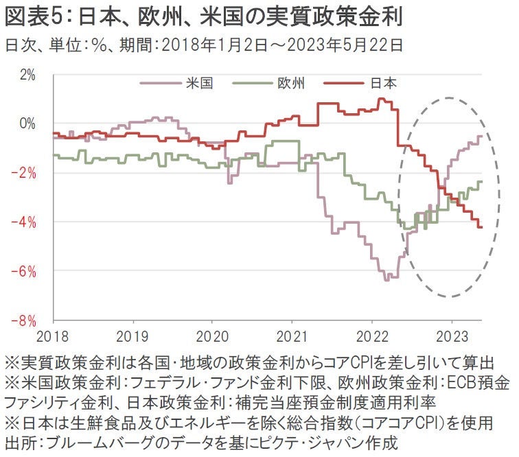 中央銀行の政策金利からコアCPI(消費者物価指数)を差し引いた実質政策金利は、欧米ではマイナス幅が縮小(実質政策金利が上昇)傾向にある。一方、日本では日銀が金融緩和政策を維持する中、足元ではインフレ率が上昇しているため、実質政策金利のマイナス幅が拡大(実質政策金利が低下)傾向にある(図表5)。