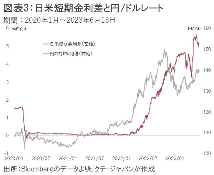 一方、日本国内では、日銀の大規模緩和が続く見込みだ。結果として、日米間には短期金利で5%近い金利差が生じている(図表3)。円キャリートレードの復活により、為替市場ではドル高・円安の流れが続くのではないか。