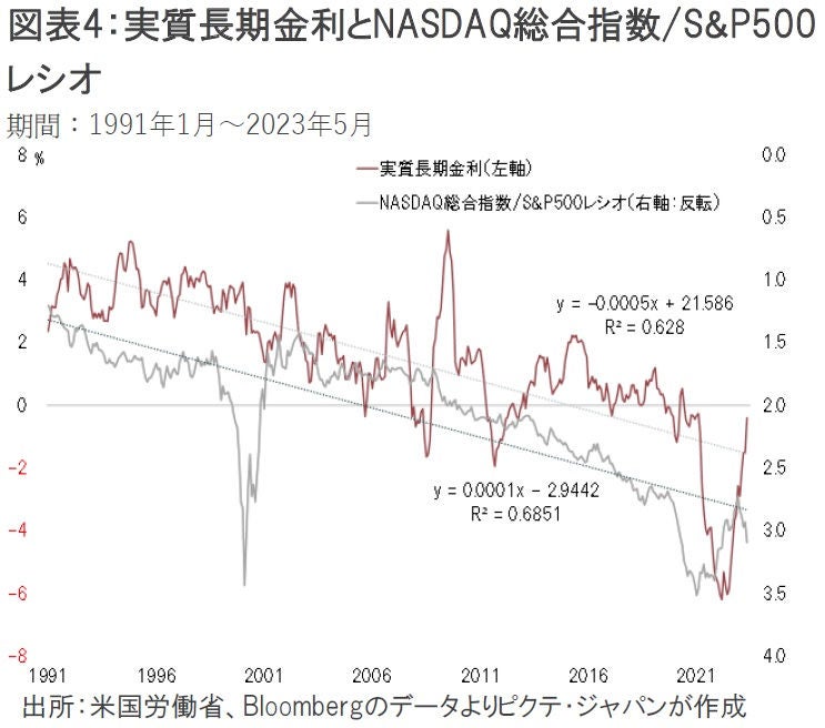 また、FRBの利上げにより、物価安定の下で30年間に亘って続いてきた実質長期金利の低下傾向に終止符が打たれた(図表4)。この長期に亘るトレンドは、マーケットにおけるリスク許容度を高め、成長株への投資を後押ししてきたと言えるだろう。NASDAQ総合指数をS&P500指数で割って求める「NASDAQ総合/S&P500レシオ」は、実質長期金利の低下に沿う形で上昇を続けてきた。