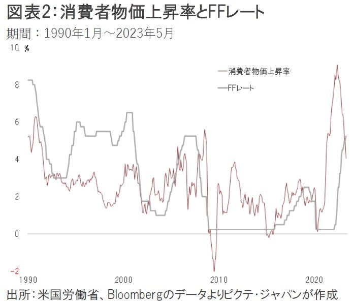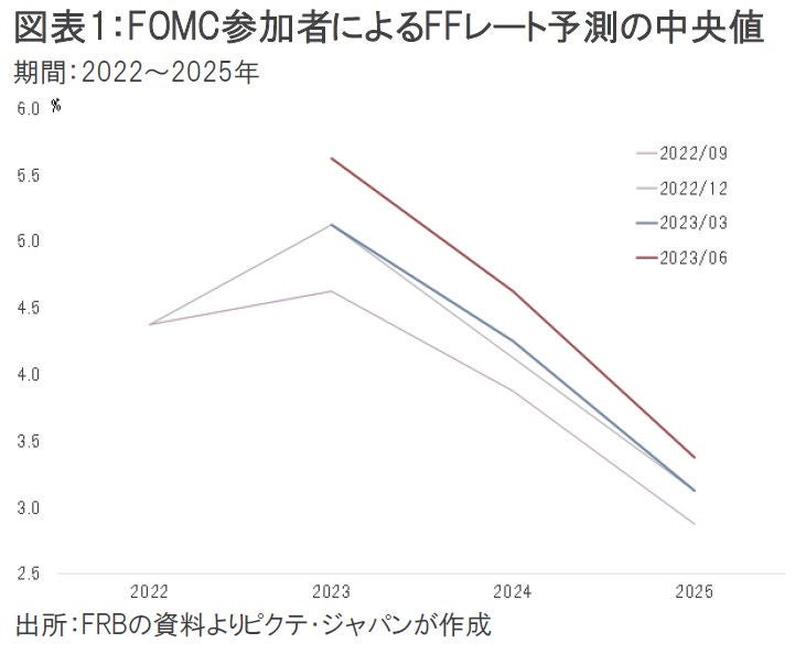 昨年3月以降、10回連続で実施してきた利上げを見送った理由について、FRBは「追加的な情報」を得るためと説明した。これは、利上げ局面がまだ終了したわけではないとの意味だろう。FOMC参加者18人による予測では、2023年末のFFレートの中央値は5.50~5.75%であり、3月時点での予測を50bp上回った(図表1)。つまり、年内においてあと2回の利上げを示唆するものだ。