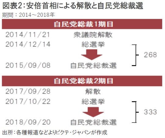 2024年9月には自民党総裁選挙が予定されている。7年8か月に亘る長期政権を維持した安倍晋三元首相の場合、再選された2回の総裁選を睨んで、その9~12か月前に衆議院を解散した(図表2)。総選挙における自民党の圧勝は、安倍元首相の指導力を強化し、同党総裁として3選された最大の要因だったと言っても過言ではない。