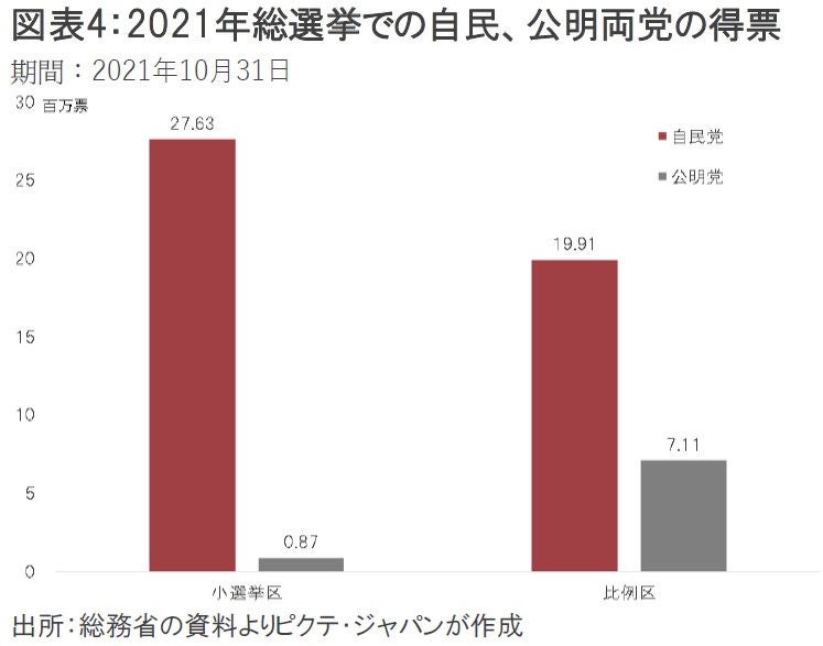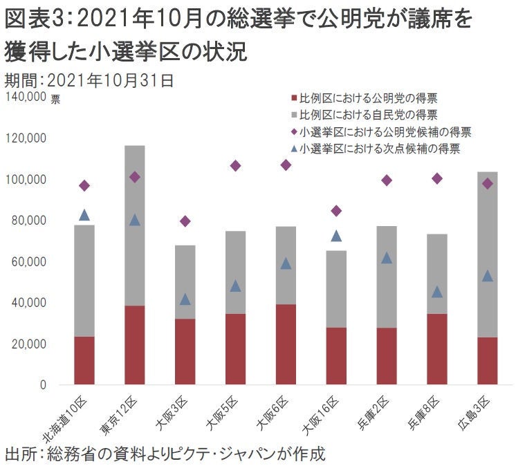 もっとも、2021年の総選挙で公明党が議席を得た小選挙区は9区だが、当該選挙区での比例区における同党の得票は平均は3万1,254票に過ぎない(図表3)。平均5万票程度に達する自民党の基礎票がなければ、公明党は小選挙区で勝てなかった可能性が強いだろう。