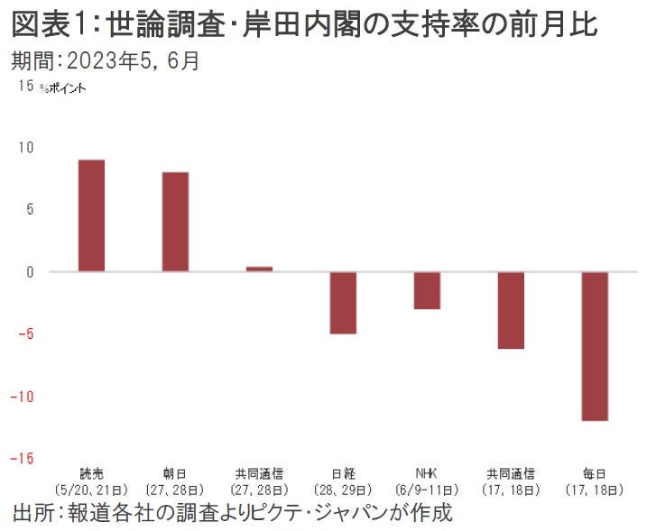 大手メディアによる世論調査を見ると、岸田内閣の支持率は今年に入って上昇基調だった。しかしながら、G7広島サミットをピークに低下に転じ、岸田首相が通常国会での解散見送りを明言した直後に行われた2社の調査では大幅な下落となっている(図表1)。政務秘書官だった長男による公邸の公的部分の私的使用問題、子ども未来戦略の財源問題などが背景だろう。