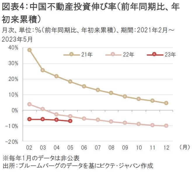 中国の不動産投資の状況はさらに悪い。年初来(累積)で捉えた中国の不動産投資伸び率は、1-5月で前年同期比7.2%減となり、1-4月の同6.2%減からさらに落ち込みが加速した(図表4)。
