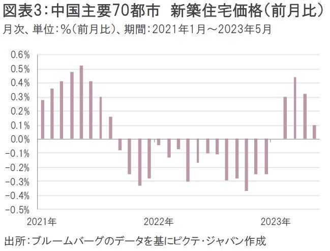 また、中国主要70都市の新築住宅価格も5月は前月比0.1%高と、23年2月から続いていた住宅価格の上昇トレンドに早くも息切れ感が出てきた(図表3)。