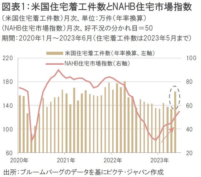 6月21日に発表された5月の米国住宅着工件数は前月比21.7%増の163.1万件(年率換算)と約1年ぶりの高水準となり、市場予想の140.0万件を大幅に上回った。また、その前日に発表された米国住宅建設業者の景況感を示す全米住宅建設業協会(NAHB)住宅市場指数は6月に55を示し、市場予想の51を上回ったほか、好不況の分かれ目となる50も超えた(図表1)。