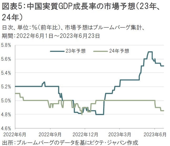 中国不動産市場における低迷の要因としては、不動産デベロッパーの資金繰りや景況感の悪化、ゼロコロナ政策の余波(貯蓄志向)、若年失業率の上昇などが挙げられる。このような状況を受けて、市場関係者は中国の実質GDP成長率予想を相次いで下方修正している。ブルームバーグが集計した中国の実質GDP成長率予想は23年、24年ともに今年6月から下方修正が目立っている(図表5)。