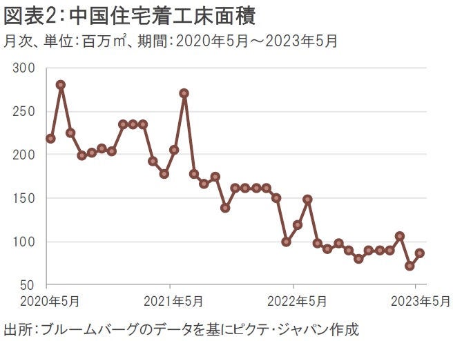 中国の住宅着工床面積は減少傾向が続いている。5月は前年同月比28.5%減の8500万平方メートルと、過去最高だった2020年6月の2億8000万平方メートルから約7割減となった(図表2)。