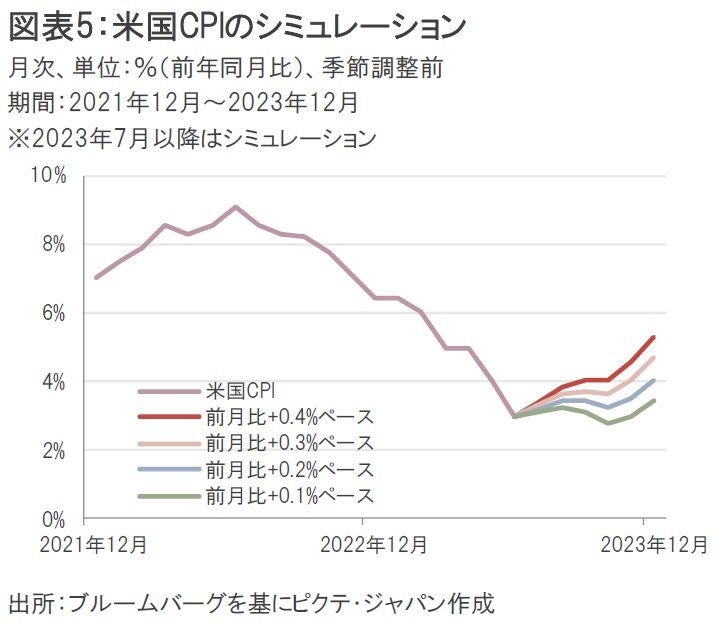実は米国CPIが年末にかけてゆるやかに減速するハードルは高い。仮に米国CPIが23年6月時点の「前月比」プラス0.3%(季節調整前)のペースで今後も推移したとすると、年末にかけて米国CPIは再加速することになる(23年12月時点でプラス4.7%)。前月比プラス0.1%のペースへ鈍化したとしても、年末までは高止まりの状態となる(23年12月時点でプラス3.4%)(図表5)。マーケットが期待するほど、ディスインフレへの道筋は平坦ではないかもしれない。