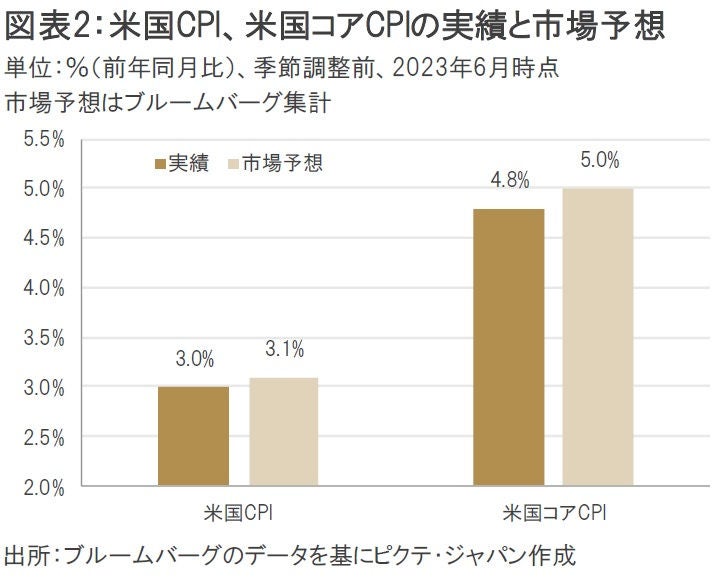 7月12日に発表された6月の米国CPI(前年同月比)は、プラス3.0%と市場予想のプラス3.1%を下回ったほか、エネルギーや食品を除く米国コアCPIはプラス4.8%と、市場予想のプラス5.0%を下回った(図表2)。