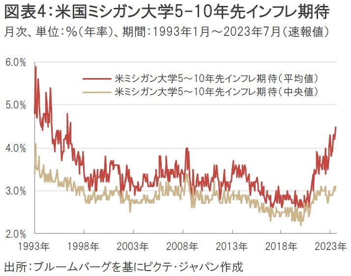相次ぐ物価指標(ハードデータ)の下振れに対して、個人へのアンケート調査(ソフトデータ)では上振れが目立つ。7月14日に発表された7月米国ミシガン大学5-10年先インフレ期待の速報値(中央値)はプラス3.1%と、市場予想のプラス3.0%を上回った。また、同じデータの平均値(市場予想無し)は7月にプラス4.5%まで上昇し、6月のプラス4.2%からさらに加速した(図表4)。
