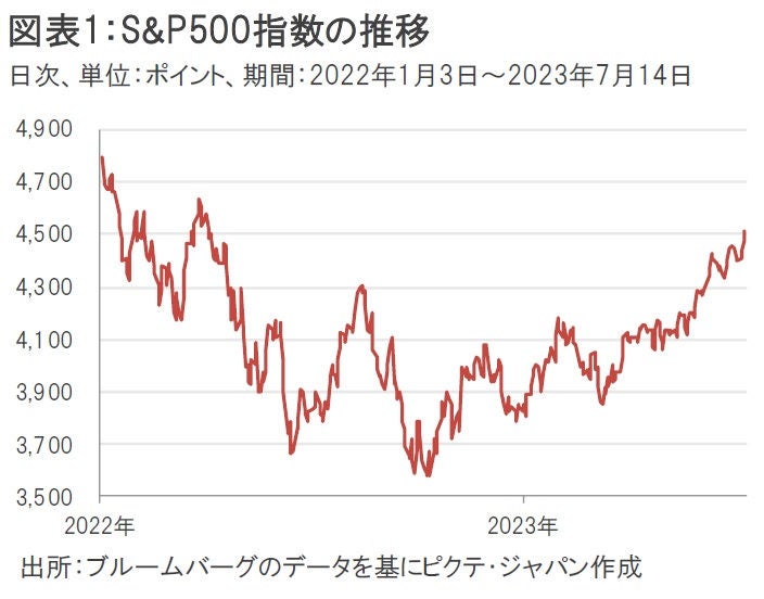 先週1週間のS&P500指数は前週比2.42%高となり、年初来高値を更新する展開となった(図表1)。6月の米国消費者物価指数(CPI)や米国生産者物価指数(PPI)が相次いで市場予想を下回り、ディスインフレへの期待が高まったことなどが要因として挙げられる。