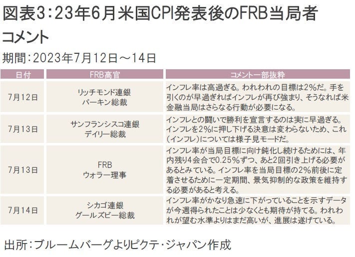 一方、シカゴ連銀のグールズビー総裁はインフレ率の低下に「期待がもてる」とコメントし、従来通りのハト派トーンをにじませた(図表3)。