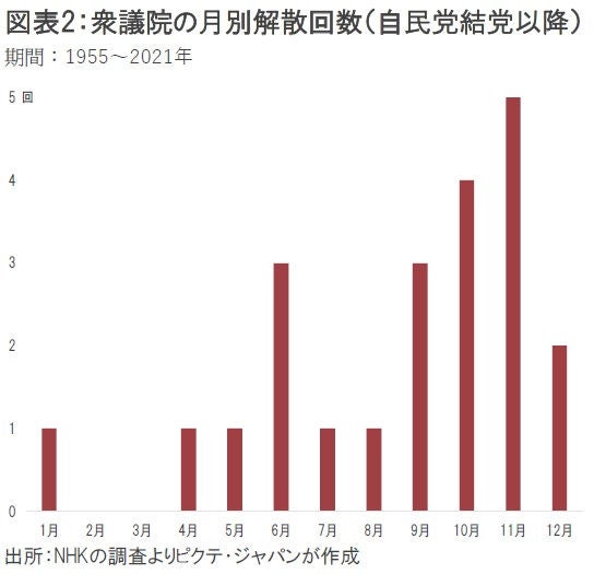 自民党が結党された1955年11月以降、解散は22回あった。このうち12回が9~11月に集中しているのは、歴代の首相が秋の臨時国会で争点を明確にし、国民に信を問うスケジュールを重視してきたからだろう。6月が3回と秋に次いで多いが、予算及び重要法案を仕上げた上で、通常国会会期末での解散が選択された結果と見られる。一方、2、3月が1回もないのは、次年度予算案の国会審議に支障を来さない政治的配慮ではないか(図表2) 。