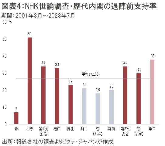 また、NHKの調査によれば、過去のべ10名の内閣総理大臣の退陣時の内閣支持率は、平均で27.1%だった(図表4)。もっとも、これには自民党総裁としての任期満了で円満に官邸を去った小泉純一郎元首相が入っている。同元首相を除いた場合の平均は24.4%だ。