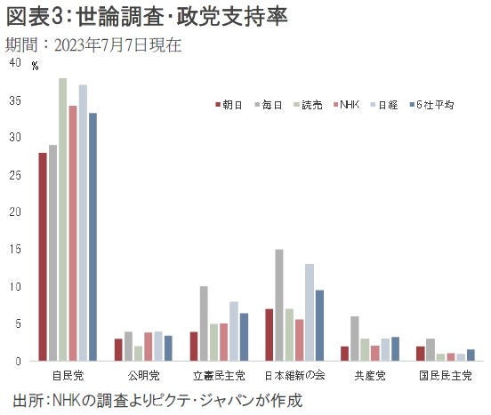 岸田首相にとっての救いは、日本維新の会を除き野党に勢いがない上、立憲民主党が衆議院小選挙区での他の野党との候補者調整を巡って迷走していることだ。報道大手5社の直近の調査による政党支持率は、自民党が平均33.2%で高水準に踏み止まり、野党側では日本維新の会が9.5%と立憲民主党の6.4%を上回った(図表3)。