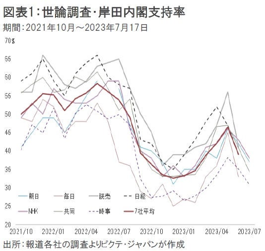 7月に入り既に報道大手4社が世論調査を実施した。岸田内閣の支持率は、当該4社の平均で6月の40.2%から、7月は35.0%へ5.2%ポイント低下している。昨年12月を底に5月まで回復基調にあったものの、6、7月は2か月連続で下落した(図表1) 。足元はマイナンバーを巡る混乱が、政権にとって大きな打撃になっているようだ。