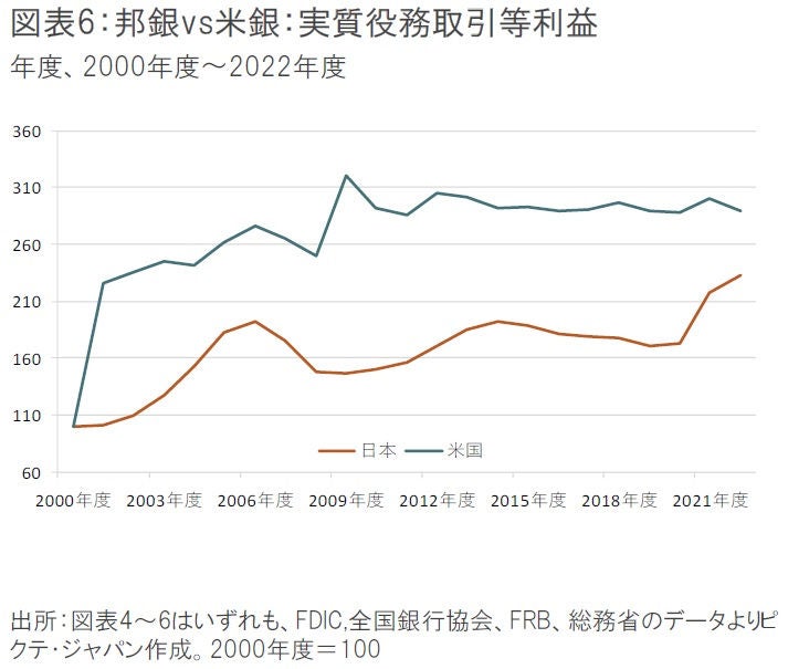 違いの主な要因は、資金利益と役務取引等利益(手数料収益)である(図表5,6)。資金利益は金利環境の違いでやむを得ないとして、インフレを考慮してもなお役務取引等利益にこれだけの差があるのはなぜか。米銀の役務取引等利益の増加要因を項目別でみると、資産運用関連手数料、保険関連手数料、投資銀行業務、預金口座手数料等の増加が著しい。これらの中には、邦銀はこれまで商慣習的に難しかった分野も多い。
