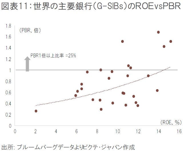 もっとも、邦銀のみならず、他の先進国でも、銀行業界は総じてPBRが低い。世界の主要銀行(G-SIBs)28行のうち、PBRが1倍を超えているのは25%、7行に過ぎず、そのうちUBSを除く6行が北米の銀行である(図表11)。資本規制や業務の制約を受ける銀行にとって、低PBRはある程度宿命である。