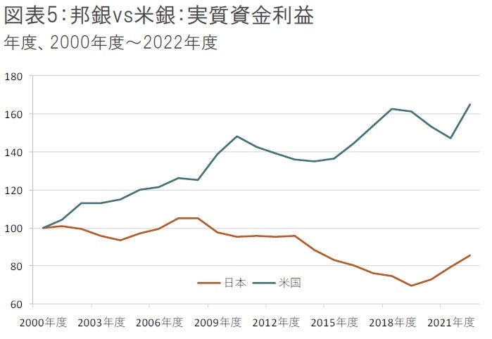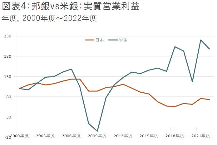 このような市場地位の低下は、利益の動きと整合的である。邦銀の実質営業利益(営業利益をGDPデフレーターで除し、両国のインフレ率の違いを調整したもの)は、2000年度を100とした場合、2022年度は73となっており、27%も低下した(図表4)。一方米銀の実質営業利益は、同じ時期に2倍近くになっている。