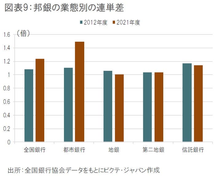 もう一つの収益構造の変化は、特に大手行で、子会社や海外など、かつての国内商業銀行業務以外の貢献である。22年3月末の都市銀行の当期利益の連単倍率(連結当期利益÷単体当期利益)は1.49倍と、9年前の1.11倍から大きく上昇している(図表9)。