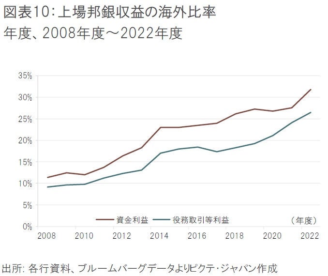 また、海外収益の増加も著しい(図表10)。邦銀の海外与信は2015年に世界一となって以来、トップを走っているし、大手行では、米国やアジアでのM&Aも活発化している。