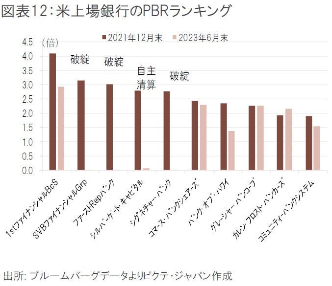 逆に、かつて高PBRを誇っていた米中堅銀行は、トップ5行中4行が経営破綻に至った(図表12)。破綻にはそれぞれに事情があり、高PBRが原因ではないものの、資本に対して高収益・高株価を追求することのリスクは意識せざるを得ないだろう。