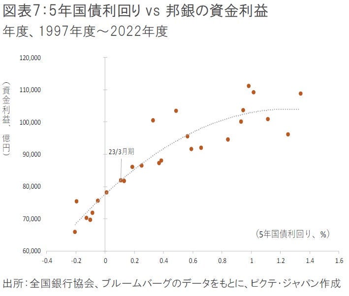 過去25年間の邦銀の資金利益は、長期金利で8割以上説明できる(図表7)。