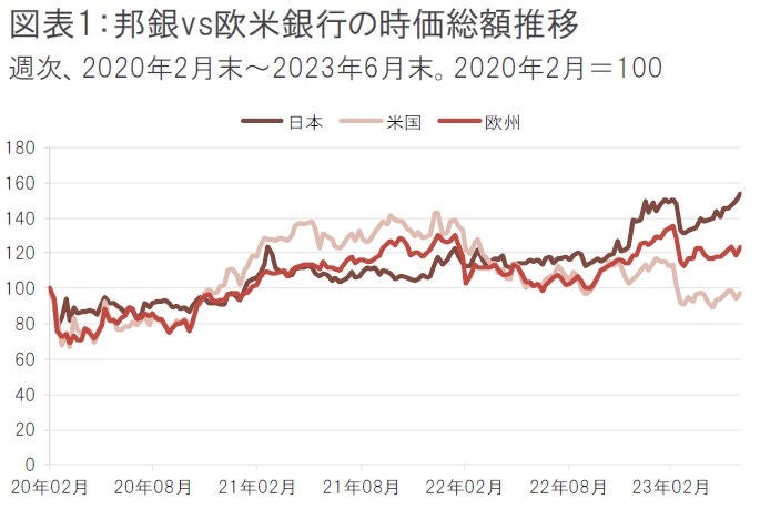 邦銀の株価が堅調だ。3月末からの東証銀行株指数は20%も上昇し、東証総合株価指数の上昇率13%を大きく上回っている(7/20終値ベース)。足元の日本の銀行セクターの株価上昇率は、他国の銀行に比べても力強い(図表1)。