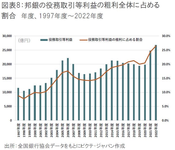 ROE拡大に向けて銀行がとりわけ重視しているのは、役務取引等利益の拡大だ。役務取引等利益は、2000年度までは、業務粗利の10%にも満たなかったが、22年度には25%まで増加している(図表8)。この増加率は、米銀と比較しても急速である(前掲図表6)。