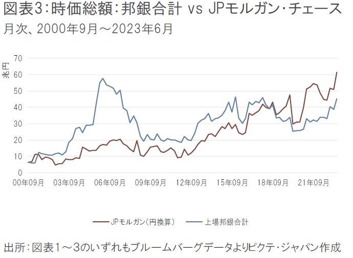 国際的にみても、邦銀の市場地位低下は著しい。2018年に上場邦銀の株式時価総額の合計値がJPモルガン・チェース1行の時価総額に追い抜かれたが、足元の株価復調後もなお、邦銀全行が束になってもJPモルガン・チェースの時価総額に勝てないという状況が続いている(図表3)。