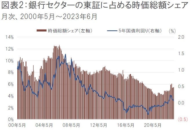 振り返れば過去20年余り、邦銀は、市場的にも収益的にも、その地位を大きく低下させてきた。東証に占める銀行セクターの時価総額シェアは、2005年に一旦トップとなったものの、その後金利の低下とともに下落した(図表2)。直近ではやや持ち直しているが、それでもシェアは全産業中第7位と、過去の輝きはまだ見られない。