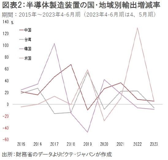 日本の半導体製造装置の輸出先は、中国、韓国、台湾、米国で全体の98%程度を占めている(図表2) 。