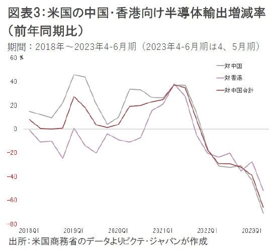 米国の対中半導体輸出額を見ると、2022年に入って減少に転じ、今年1~5月は前年同期比65.9%減の大きな落ち込みになった(図表3)。