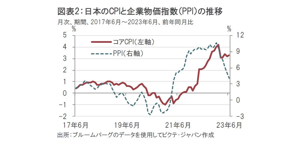 日本の物価動向がYCC修正を導いた可能性があることから、コア消費者物価指数(除く生鮮食品、CPI)を確認します。展望レポートでは物価はプラス幅を縮小したあと、賃金・価格設定行動などの変化を伴う形で、再びプラス幅を拡大すると見込まれています。原材料価格等を反映する企業物価指数(PPI)はCPIに先行して低下傾向となっています(図表2参照)。インフレ率であるCPIも低下は見込まれますが、年後半の食料品の値上げ予定や賃金動向などから、CPIは思ったほど下がらないといった観測も市場から聞かれます。日本の債券市場が落ち着いていたこのタイミングに、将来の思わぬ物価上昇で困らぬように先手を打ったことがYCC修正の背景とみられます。