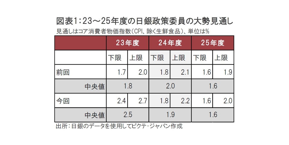 しかし植田総裁が会見で説明した2つの点に目当たらしさが感じられます。1点目は1%の上限を「念のため」と説明したことです。2点目は物価の不確実性が極めて高いとした点です(図表1参照)。