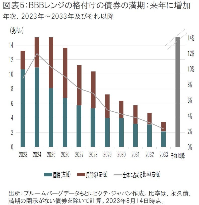 一方、BBBレンジの債券の残高は世界で約60兆ドルに上る。このうち永久債を除く債券の12%が来年満期を迎える(図表5)。