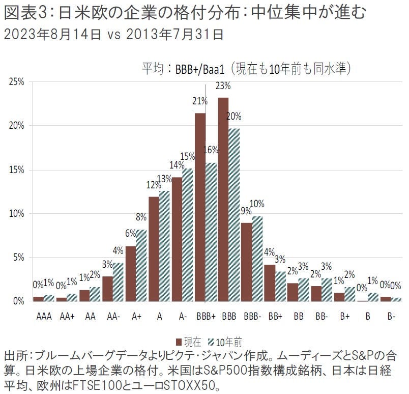 第二に、格付けの中位集中である。日米欧の上場企業の格付け分布をみると、過去10年で、平均はいずれもBBB+(ムーディーズはBaa1)で変わっておらず、甘くなっている印象はない(図表3)。