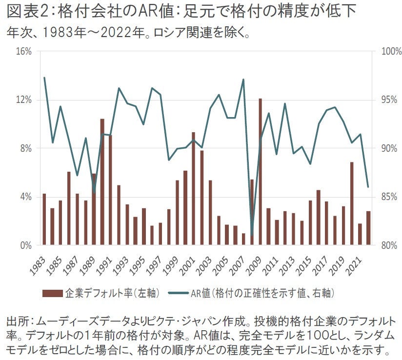 第一に、格付けの正確さを示すAR値(Accuracy Ratio、格付会社によって呼び方は異なる)の低下である(図表2) 。